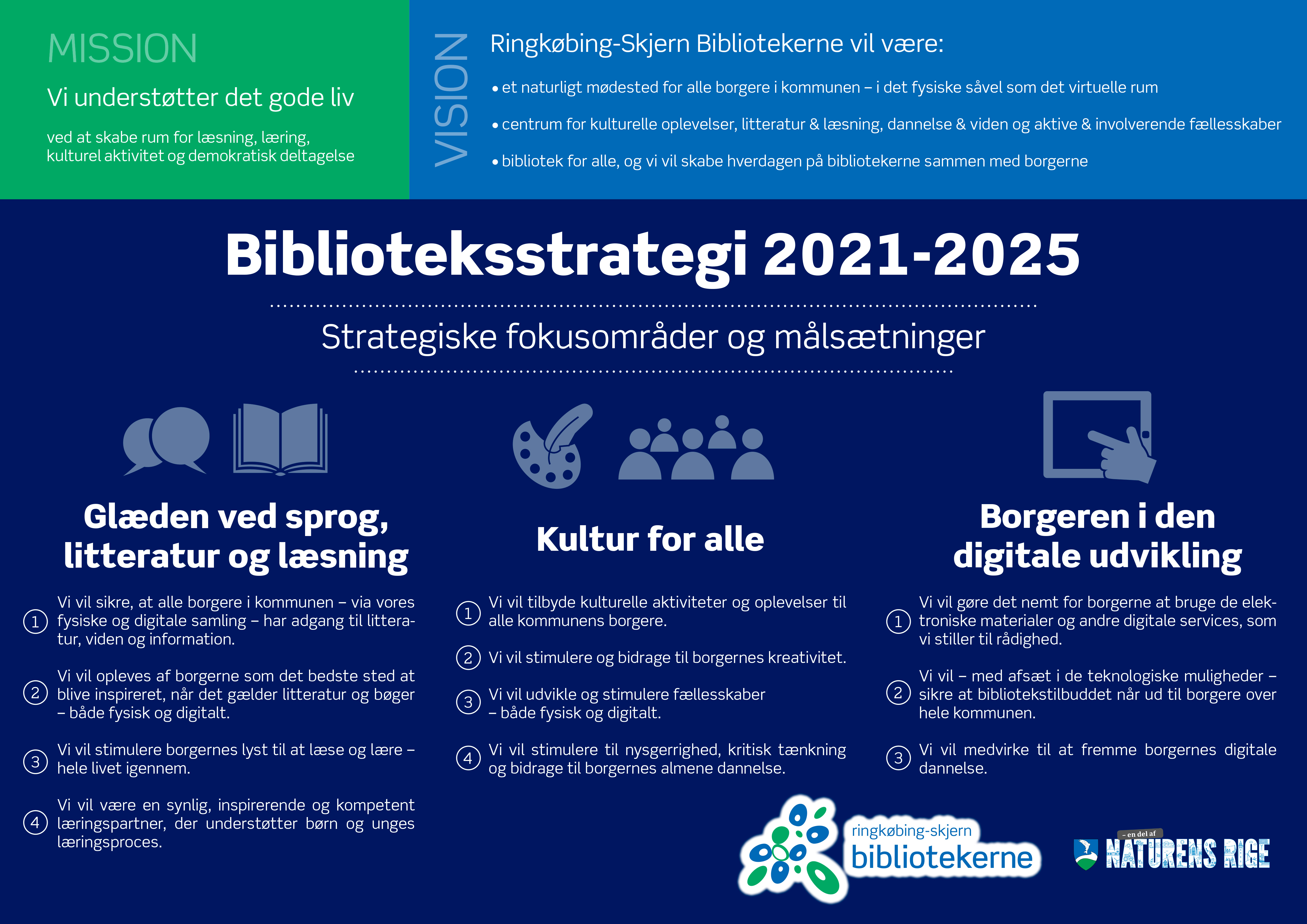- Vi vil sikre, at alle borgere i kommunen – via vores fysiske og digitale samling – har adgang til litteratur, viden og information.